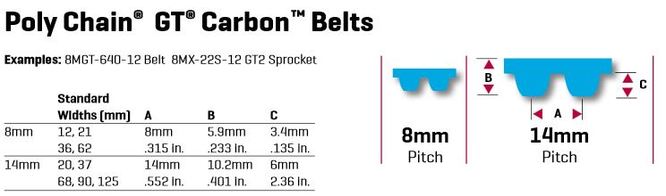 As correias sincronizadoras Poly Chain GT Carbon têm uma reputação renomada por seu alto desempenho e redução de custos em uma grande variedade de aplicações. Projetadas para lidar com distâncias entre centros mais longas e com altas capacidades de potência e torque, utilizam cordonéis de fibra de carbono patenteados para aumentar a capacidade de tração e flexibilidade, ao mesmo tempo que permitem o uso de polias tensoras nas costas da correia. O corpo em poliuretano resiste a produtos químicos, óleo, poluentes e abrasão em temperaturas extremas de -54°C a +85°C.